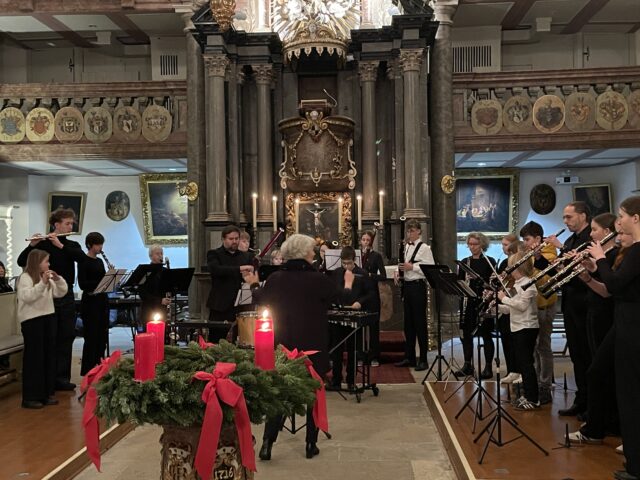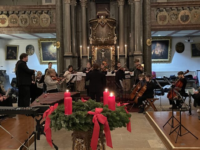 Beim Konzert in der Ordenskirche traten unter anderem der Streicherspielkreis und der Kinderchor 3 auf und sorgten für weihnachtliche Atmosphäre. In dem besonderen Ambiente der Kirche erklangen auch zwei wundervoll gespielte Stücke für Harfe bzw. Oboe mit Orgel. Für den stimmungsvollen Höhepunkt sorgte zum Ausklang ein großes Ensemble mit Holzblasinstrumenten -unterstützt vom Schlagwerk- unter Leitung von Antje Lotz.